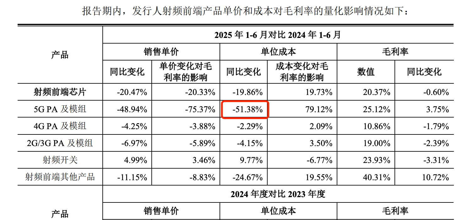 毛利率的提升通常源于售價(jià)提高或成本下降。然而,昂瑞微面臨的是截然相反的境況。公司對(duì)此的解釋是“5G PA及模組的成本一年之內(nèi)降低了51.38%”。公司披露的射頻前端產(chǎn)品三大成本要素——晶圓、封測(cè)、基板——在2025年上半年的變動(dòng)幅度僅為個(gè)位數(shù):晶圓價(jià)格下降4%,封測(cè)費(fèi)用下降7%,而基板費(fèi)用甚至上漲了50%。