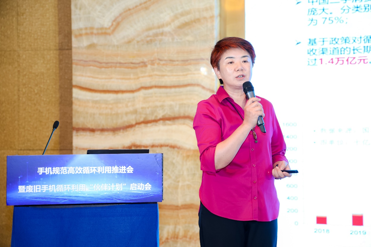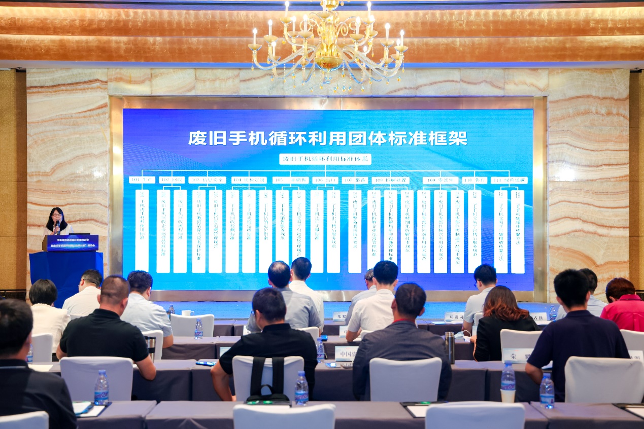 中國循環(huán)經(jīng)濟(jì)協(xié)會(huì)互聯(lián)網(wǎng)+資源循環(huán)利用專委會(huì)秘書長侯允在會(huì)上發(fā)布廢舊手機(jī)循環(huán)利用團(tuán)體標(biāo)準(zhǔn)框架。(主辦方供圖)